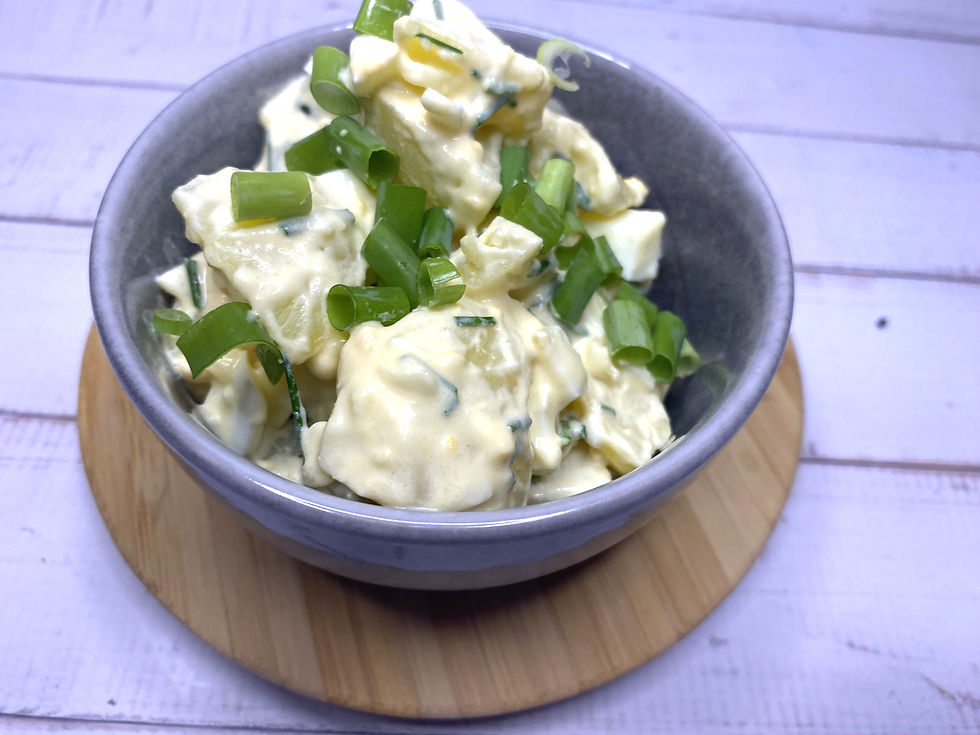 Finely chop the hard boiled eggs. Add to a bowl with the mayonnaise, sour cream, vinegar and spring onions. Mix very well so that the egg is well incorporated into the dressing. Add salt to taste.